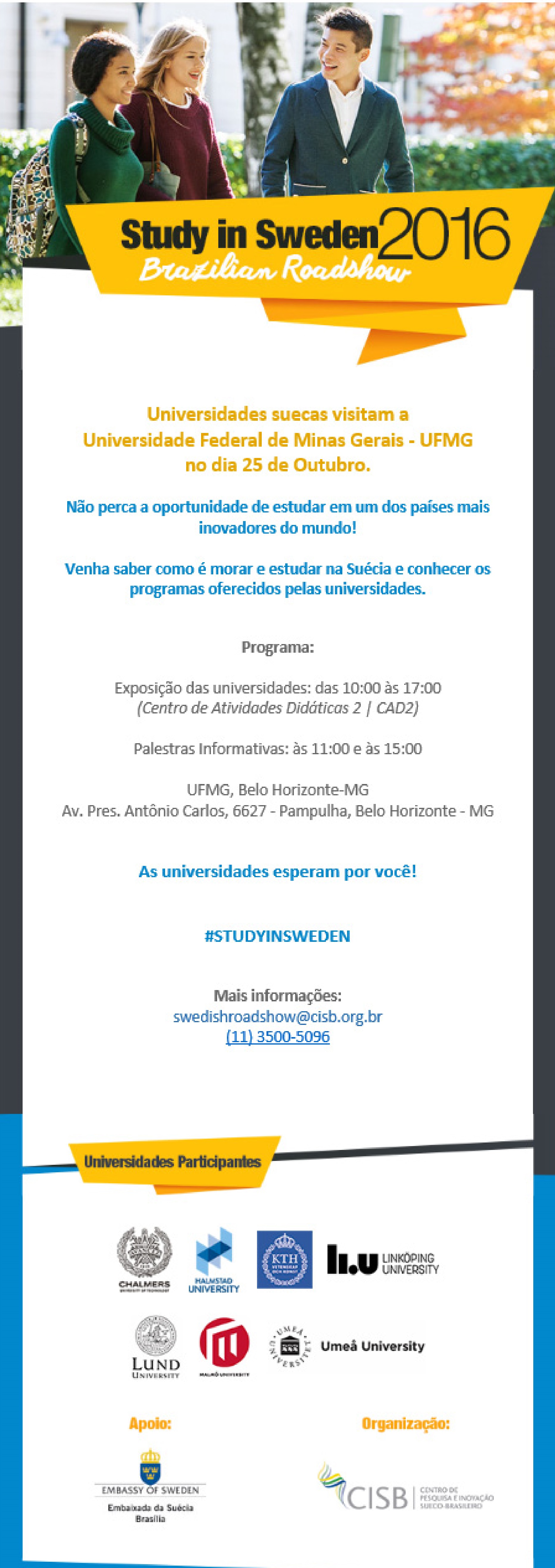 Representantes do meio acadêmico sueco estarão no campus Pampulha da UFMG, no dia 25 de outubro, terça-feira, para apresentar oportunidades de estudo voltadas para estudantes de graduação e pós-graduação interessados em estudar na Suécia.