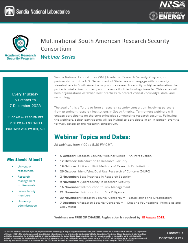 Para isso, o Sandia National Laboratories convida a participar de dez webinários remotos que envolverão os participantes nos princípios básicos relacionados à segurança da pesquisa. Após os webinários, participantes selecionados serão convidados para um evento presencial a fim estabelecer formalmente o consórcio multinacional de pesquisa.
