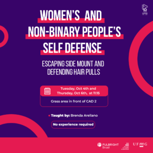 Durante essa semana, Brenda Arellano, assistente de ensino de língua inglesa Fulbright (English Teaching Assistants – ETAs), oferece aulas de defesa pessoal direcionadas a mulheres e pessoas não binárias.