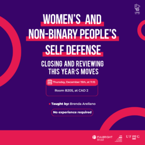 Durante esta semana, Brenda Arellano, assistente de ensino de língua inglesa Fulbright (English Teaching Assistants – ETAs), oferece aulas de defesa pessoal direcionadas a mulheres e pessoas não binárias.