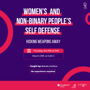 Nesta semana, Brenda Arellano, assistente de ensino de língua inglesa Fulbright (English Teaching Assistants – ETAs), oferta aulas de defesa pessoal direcionadas a mulheres e pessoas não binárias.
