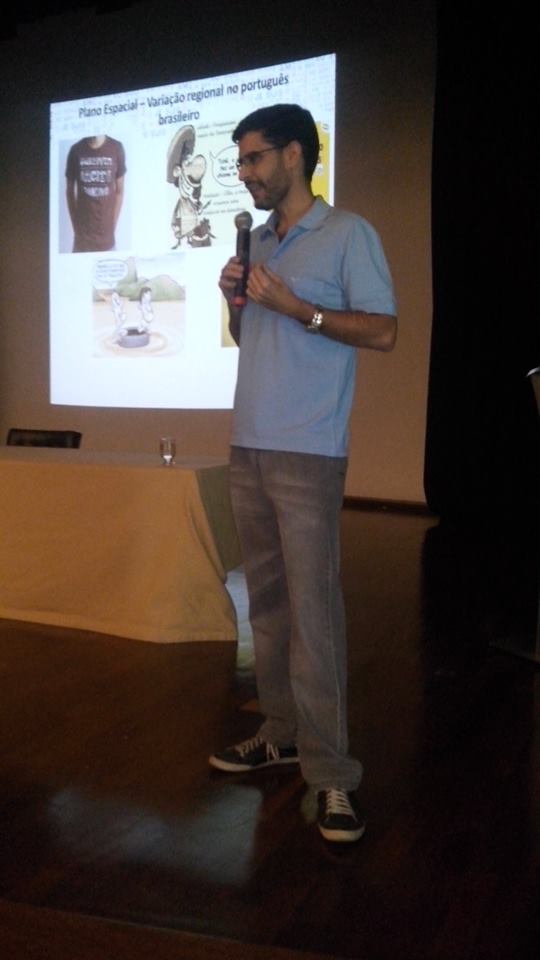 O professor Leandro Rodriguez Alves Dinis da Faculdade de Letras (FALE) encerrou a programação com palestra que discutiu aspectos da língua portuguesa e a disciplina de português como língua adicional, que será oferecida aos intercambistas pelo setor de proficiência da DRI. Na ocasião, o professor tratou de temas como a aprendizagem da língua portuguesa, a variação que pode ser encontrada no sotaque ou até mesmo no uso da língua dependendo de cada região ou posição social e também repassou as informações necessárias para que os estudantes pudessem se inscrever na disciplina de português como língua adicional.