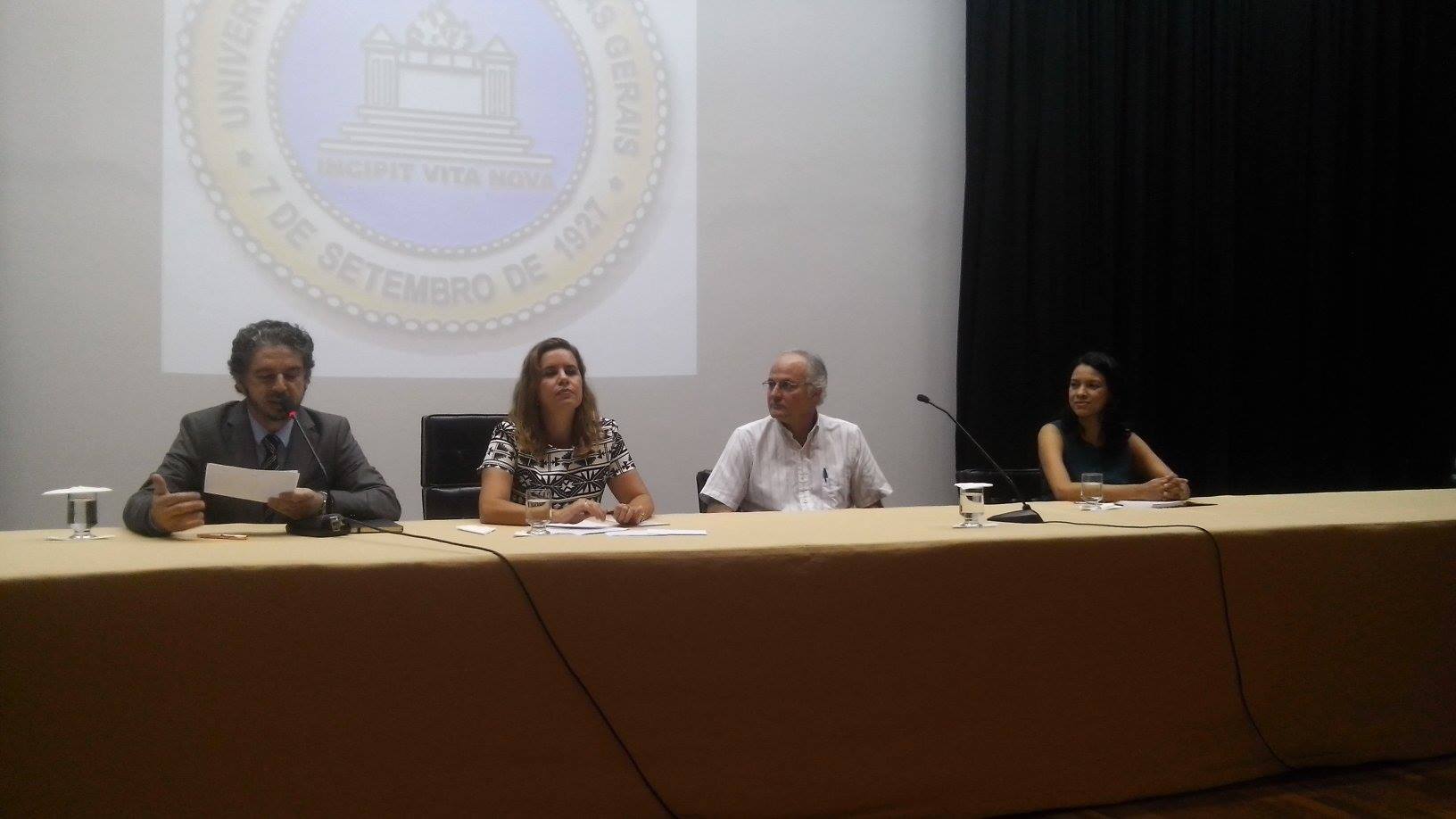Da esquerda para a direita: prof. Fabio Alves, Diretor de Relações Internacionais, profa. Sandra Goulart Almeida, Vice-reitora , prof. Tarcísio Mauro Vago, Pró-reitor de Assuntos Estudantis e a Diretora-adjunta de Relações Internacionais, profa. Míriam Jorge.