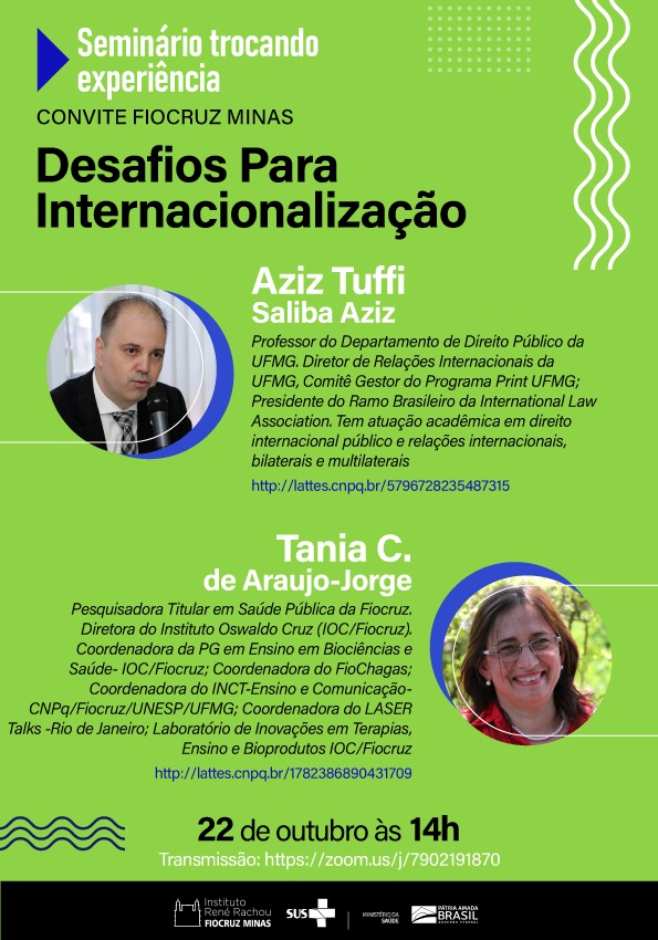 O evento contará com a presença do professor Aziz Tuffi Saliba, Professor do Departamento de Direito Público da UFMG e Diretor de Relações Internacionais da UFMG, e a Pesquisadora Titular em Saúde Pública da Fiocruz e Diretora do Instituto Oswaldo Cruz, Tânia C. de Araujo-Jorge.