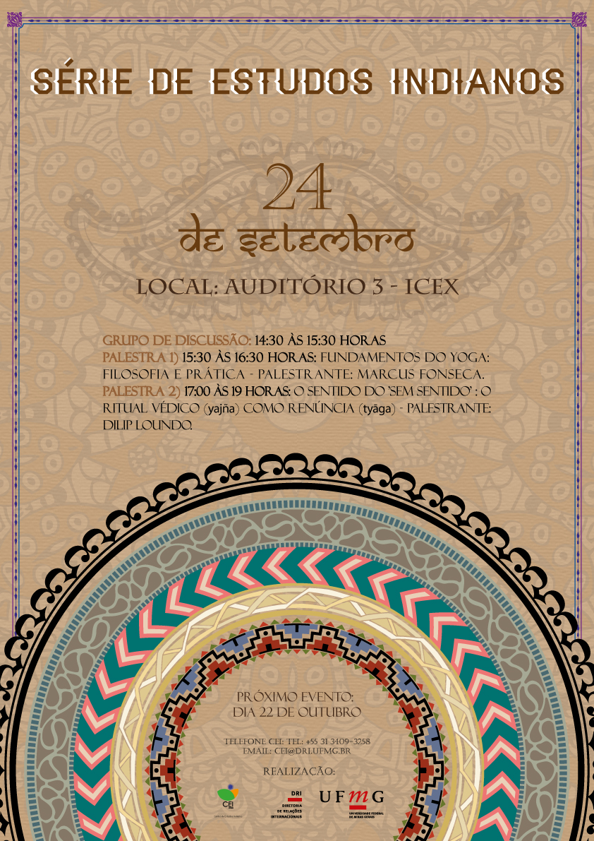 O Centro de Estudos Indianos (CEI), que integra a Diretoria de Relações Internacionais (DRI) da UFMG, promoverá mais um encontro da Série de Estudos Indianos, no próximo dia 24 de setembro, no auditório 3 do ICEX, das 14h30 às 19h00.