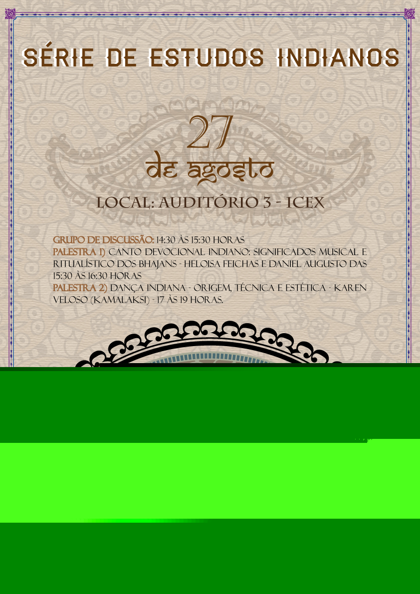 O Centro de Estudos Indianos da UFMG (CEI) promove no dia 27 de agosto, mais um evento da Série de Estudos Indianos. O evento ocorre das 14h30 às 19h00 no auditório 3 do ICEX com programação que abrange apresentações de canto e dança, bem como um encontro que visa reunir interessados nos estudos indianos para discussão em grupo.