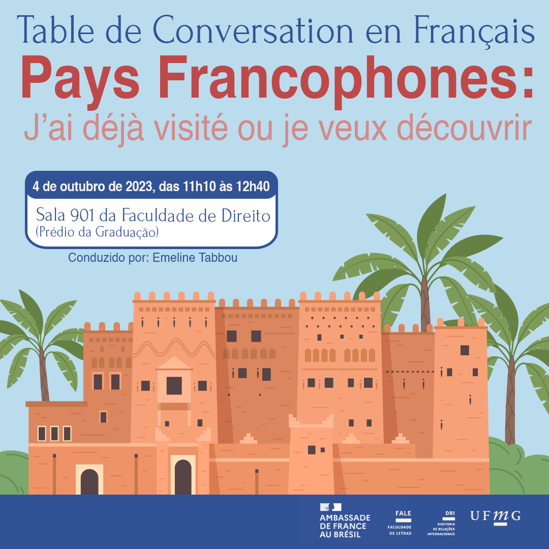 O Setor de Proficiência Linguística da Diretoria de Relações Internacionais (DRI) da UFMG e a Rede Francófona da Faculdade de Direito convidam toda comunidade acadêmica a participarem do “Table de Conversation en Français”, conduzido por Emeline Tabbou, assistente de ensino de língua francesa na UFMG.