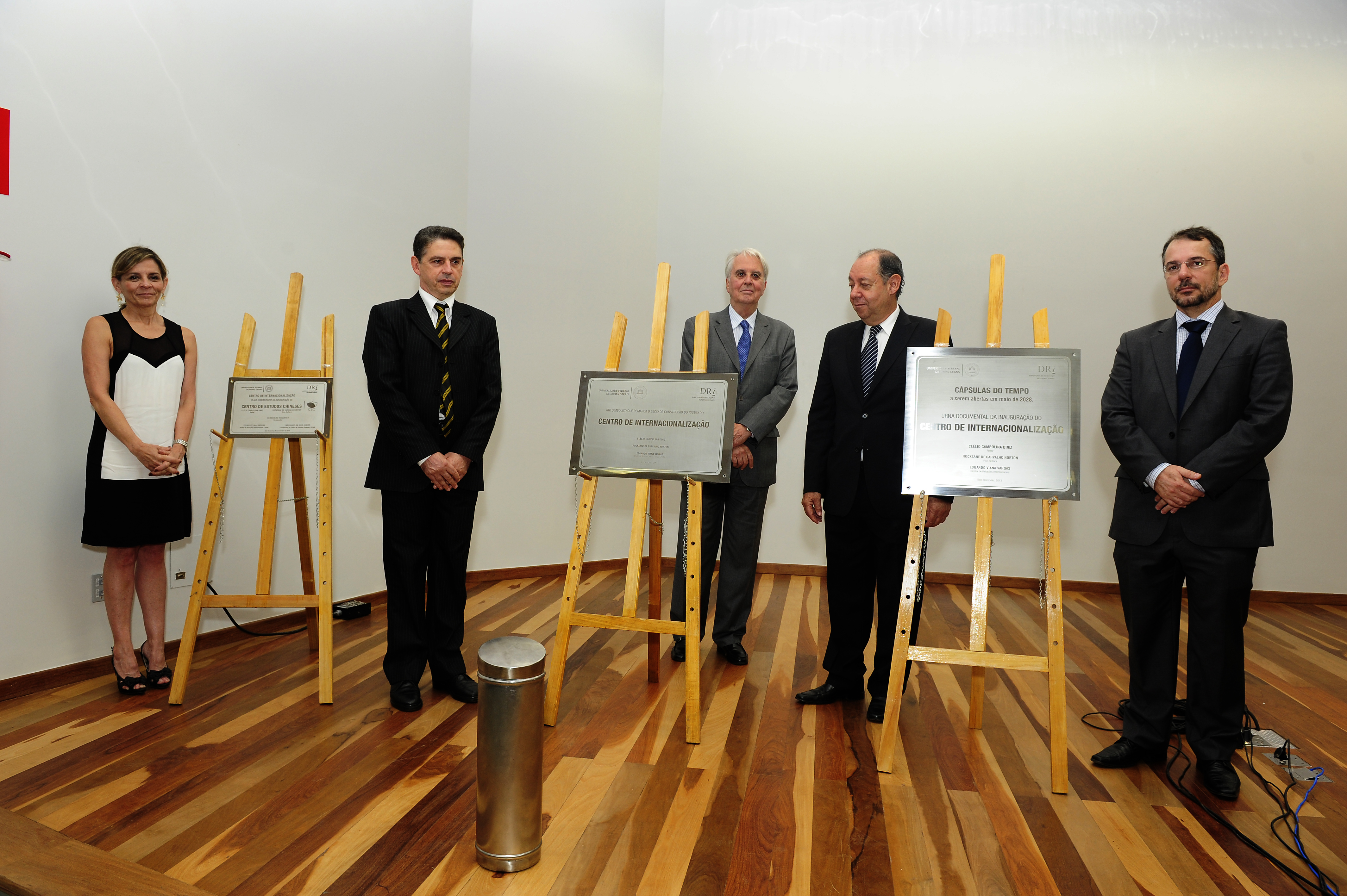 Solenidade de inauguração do CEC e do Centro de Internacionalização. Da esquerda para a direita: Rocksane de Carvalho, Vice-Reitora, Fábio Alves, Diretor do CEC, Clodoaldo Hugueney, representante da Embaixada, Clélio Campolina, Reitor, e Eduardo Vargas, Diretor da DRI. Créditos: Foca Lisboa.