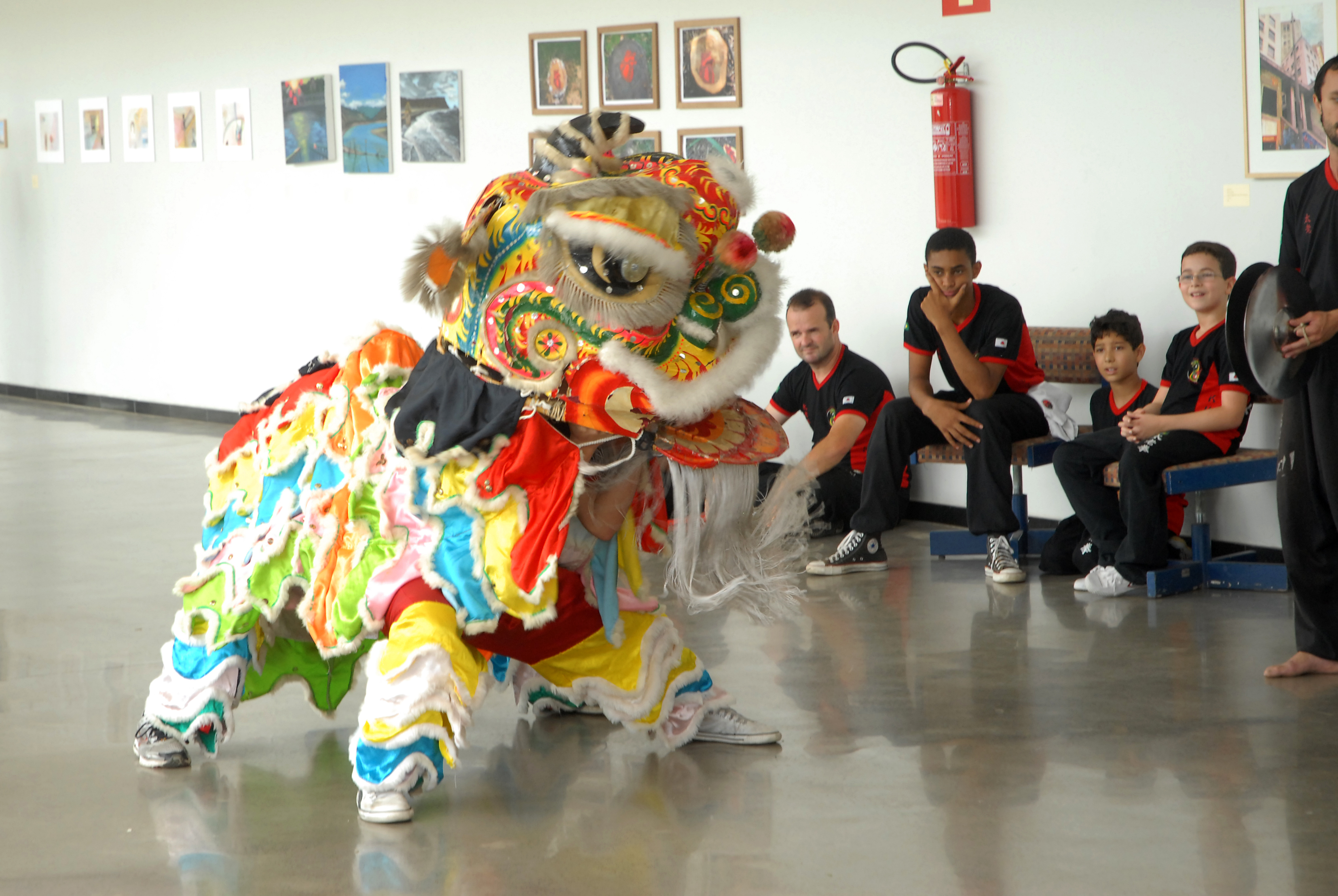 Membros da Academia de Kung Fu Tai Lau Chuan apresentaram a Dança do Leão, tipicamente chinesa, durante a inauguração do Instituto Confúcio. Créditos: Sarah Dutra.