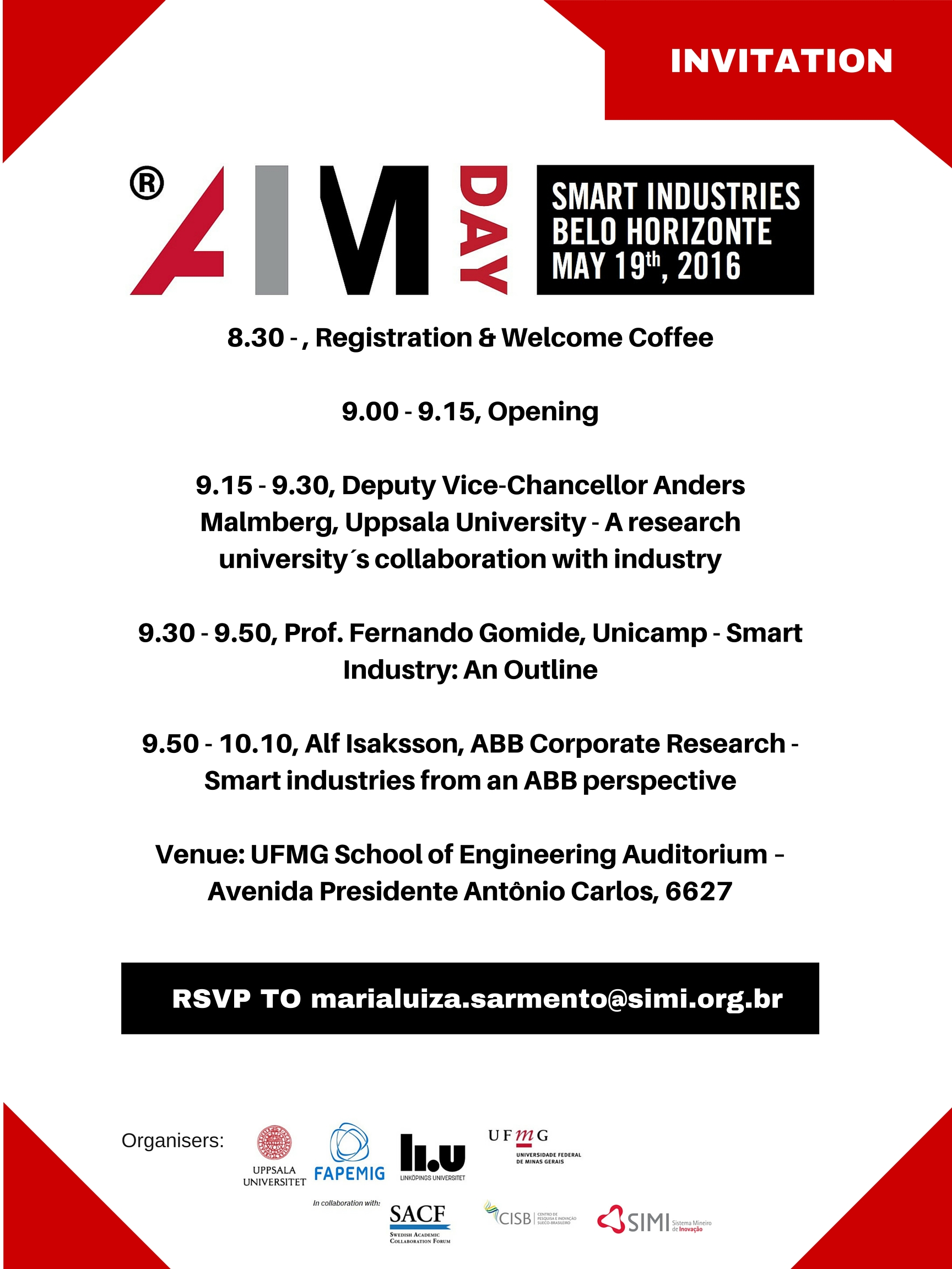 Acontece no dia 19 de maio, em Belo Horizonte (MG), o Workshop AIMday Smart Industries, que reunirá representantes da academia e de grandes empresas com o objetivo de encontrar soluções para os desafios da chamada indústria inteligente (smart industry).
