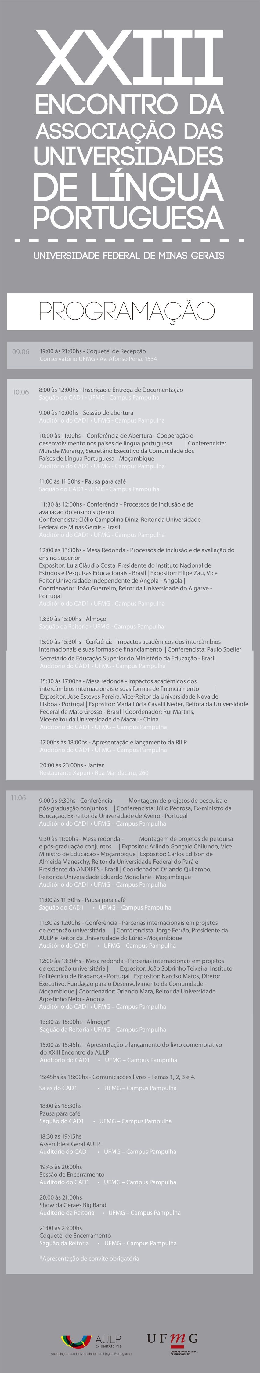 Entre os dias 9 e 11 de junho acontecerá na UFMG o XXIII Encontro Anual da AULP (Associação de Universidades de Língua Portuguesa). O evento contará com a presença de diversos Ministros de Estado, além de reitores de universidades brasileiras, portuguesas e dos países africanos de língua portuguesa.