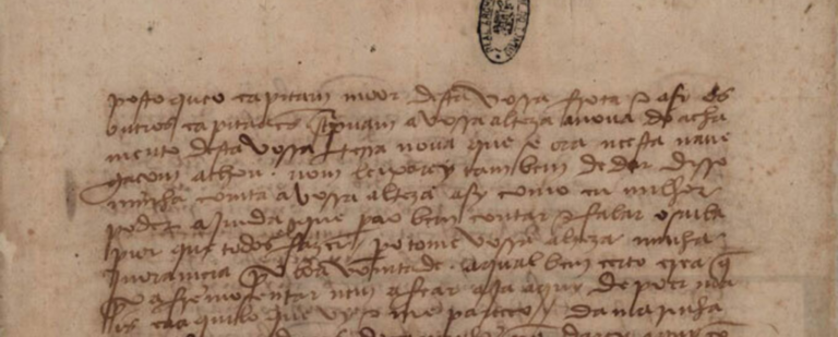 “E dali avistamos homens que andavam pela praia, uns sete ou oito, segundo disseram os navios pequenos que chegaram primeiro. […] Pardos, nus, sem coisa alguma que lhes cobrisse suas vergonhas” (Cortesão, 2003, grifo nosso). Carta de Pero Vaz de Caminha (1500). (Créditos: Arquivo da Torre do Tombo, Portugal).
