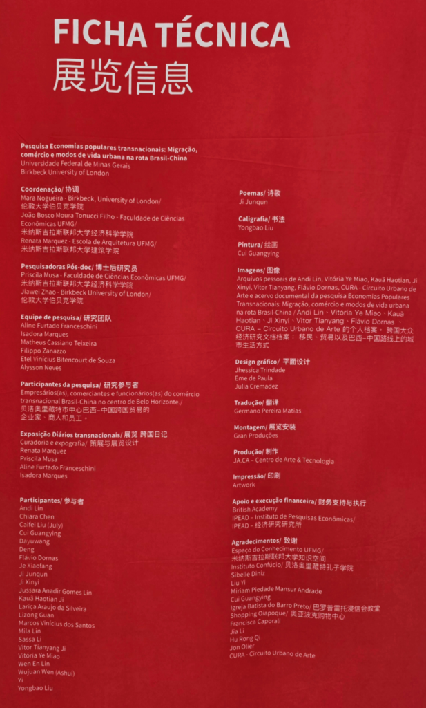 A exposição Diários Transnacionais apresenta ao público os resultados de uma pesquisa internacional dedicada a investigar as relações entre migração, comércio e formas de subsistência urbana na rota Brasil–China. A iniciativa nasce de uma parceria entre a Birkbeck, University of London, e a UFMG, com coordenação da Profa. Mara Nogueira (PI) e colaboração dos Profs. João Tonucci (Cedeplar/FACE/UFMG) e Renata Marquez (EA/UFMG). O projeto foi contemplado com financiamento da British Academy, por meio do edital UK’s Official Development Assistance (ODA) – International Interdisciplinary Research Projects 2024.