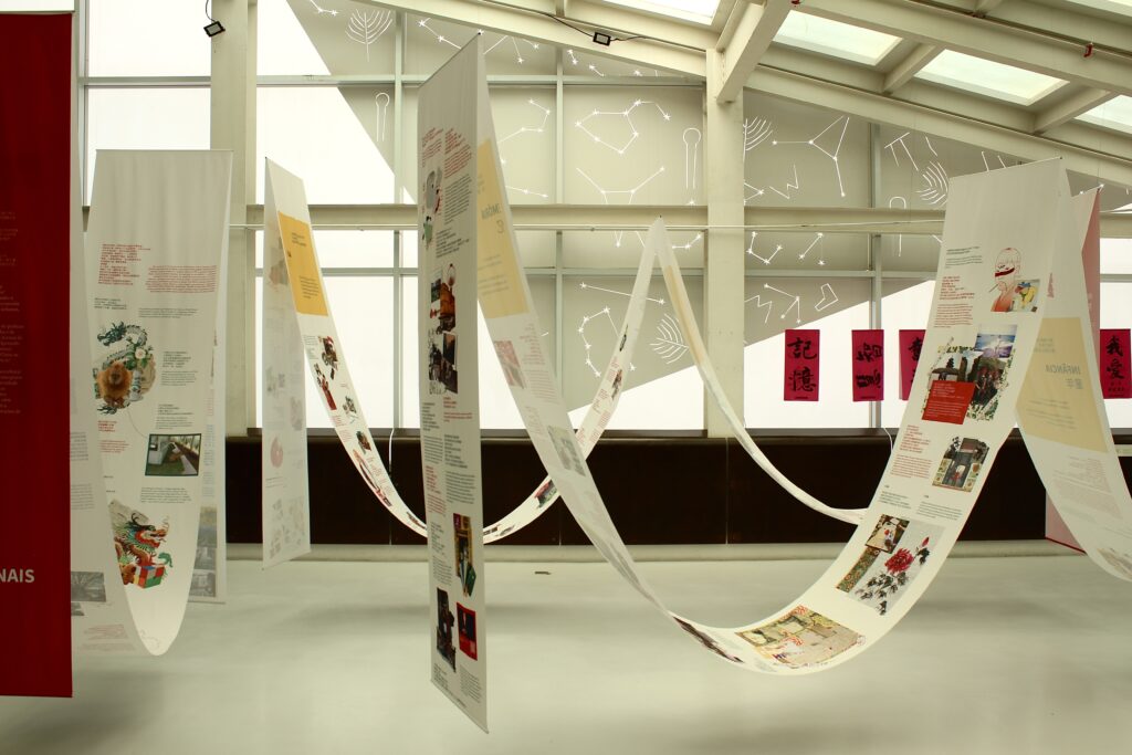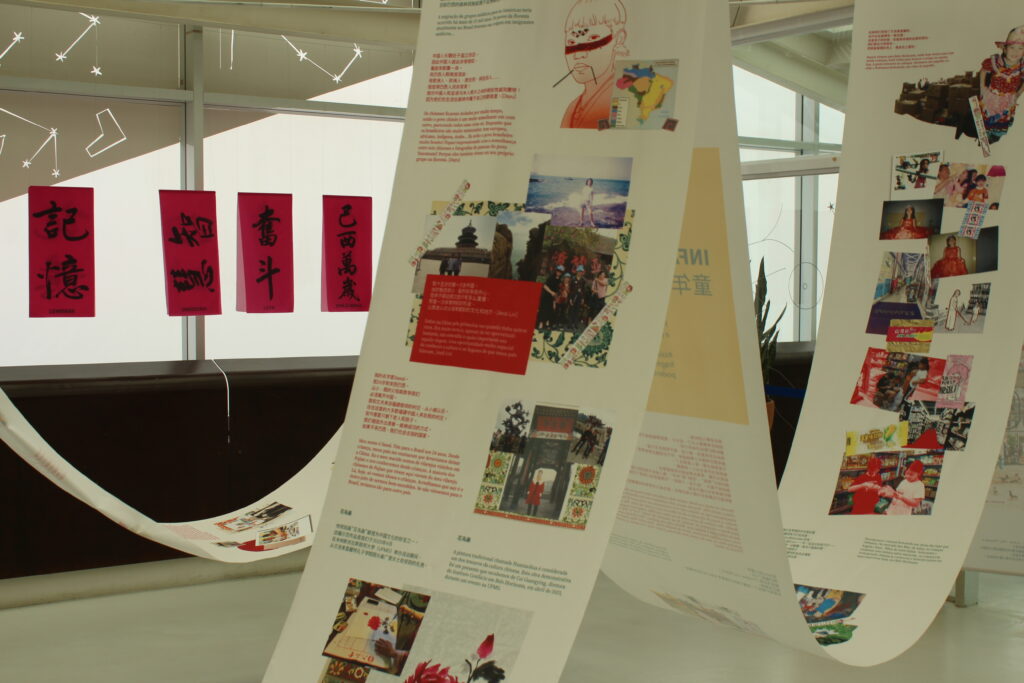 展览装置提出一种“流动地形”,由悬挂的彩色织物组成,并由竹竿、尼龙线和钢缆引导。这些元素在5楼大厅中漂浮,引领参观者穿越印有双语(葡萄牙语、普通话)照片和文本的织物卷轴。
