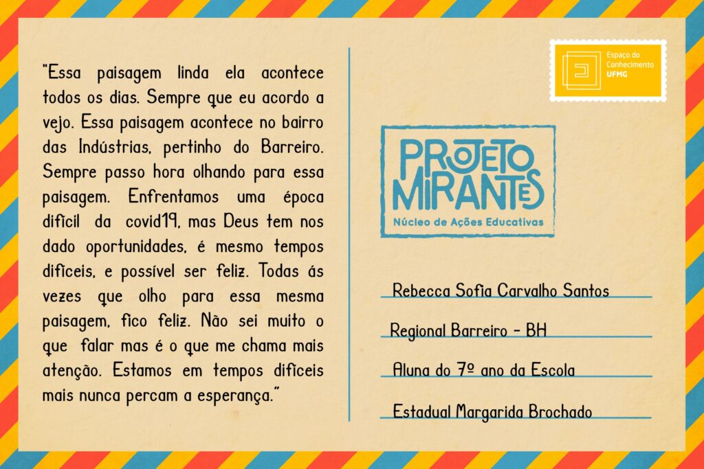 Para isso, o projeto utiliza cartões postais, por ser uma forma de registro de lugares, paisagens, sentimentos e percepções, e assim compartilhá-las com outras pessoas. Em um momento tão desafiador da nossa história coletiva, o projeto Mirantes constrói um registro particular ao produzir uma série de postais baseados em fotografias e relatos de alunos e professores das redes públicas de ensino básico de Belo Horizonte, com seu olhar pessoal sobre a cidade hoje, emoldurado pelas janelas de suas casas.