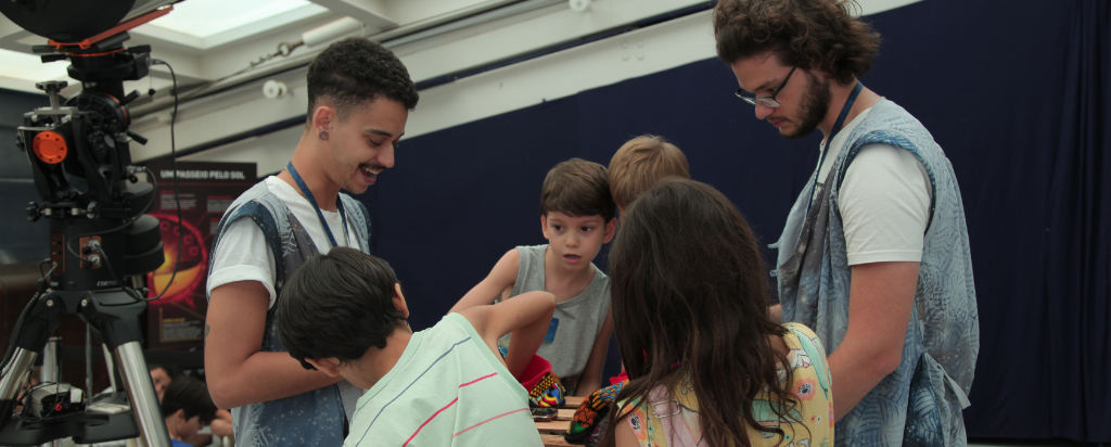 Descrição: A cada 15 minutos, um grupo de 15 pessoas tem acesso ao terraço para observar nos telescópios e tirar suas dúvidas com os mediadores que acompanham a atividade.