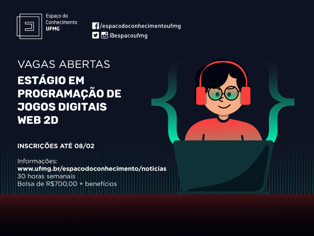 O Espaço do Conhecimento UFMG está com 2 (duas) vagas abertas para Estágio em Programação de Jogos Digitais WEB 2D, sendo uma para 5 meses e outra para 6 meses de trabalho.