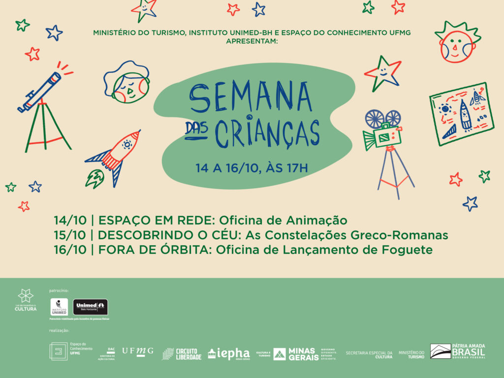 O Espaço do Conhecimento UFMG organizou uma programação especial para a Semana das Crianças! De 14 a 16 de outubro, atividades lúdicas, educativas e, claro, super divertidas, serão ofertadas nos canais digitais do Espaço. Confira: