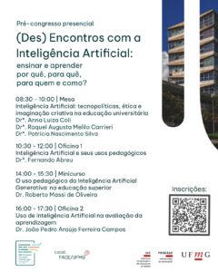 “Esse encontro constitui uma oportunidade formativa para professores e futuros professores universitários construírem reflexões conjuntas e fazerem apropriações adequadas de estratégias pedagógicas para o ensino superior com uso da Inteligência Artificial” pontua Bruno Otávio Soares Teixeira, pró-reitor de Graduação da UFMG. “Trata-se de uma questão emergente e necessária para o desenvolvimento do ensino de forma contextualizada, crítica e colaborativa entre os professores da instituição”, complementa.