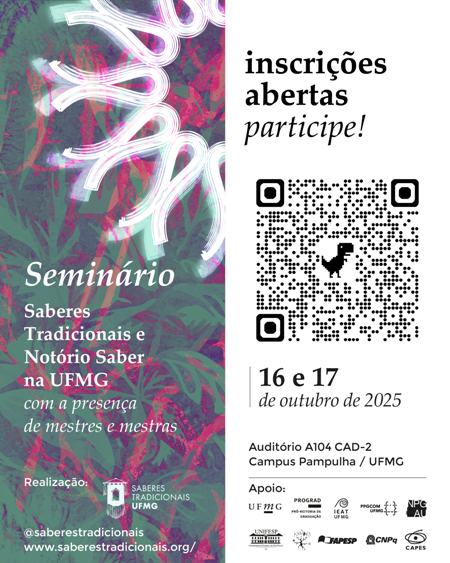 Nos dias 16 e 17 de outubro de 2025, será realizado na UFMG o Seminário Saberes Tradicionais e Notório Saber. O evento terá lugar no auditório A104 do Centro de Atividades Didáticas 2 (CAD2) da UFMG. .