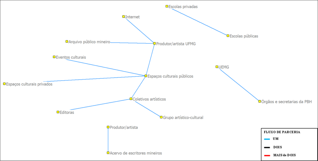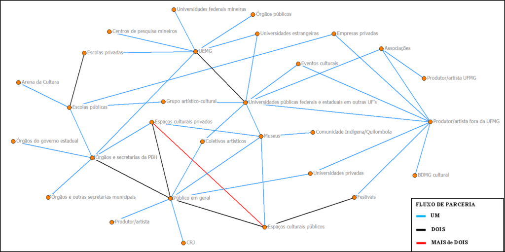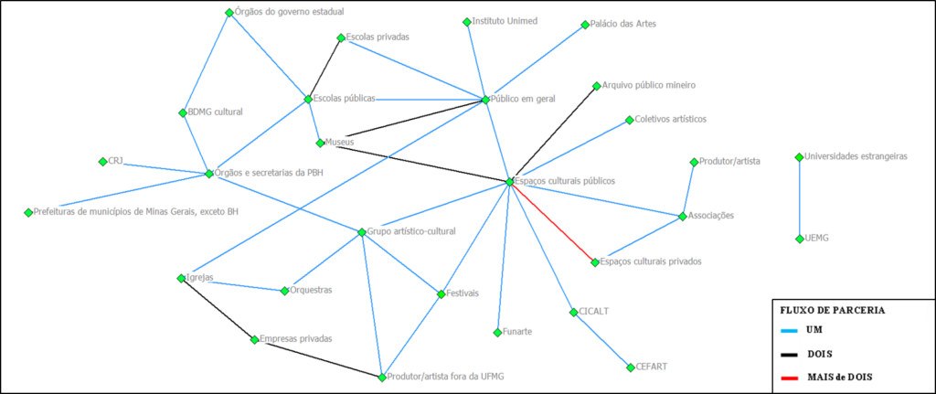 A maioria dos parceiros dos estudantes encontram-se fora das universidades. Dos 182 estudantes que manifestaram ter parcerias com agentes externos à UFMG, 84 possuem ligação com, no mínimo, dois parceiros. Espaços culturais são o centro dos fluxos e, grande parte dos estudantes que possuem parceria com espaços culturais públicos também possui parceria com espaços culturais privados. Observam-se relações com museus, igrejas, empresas privadas, produtor/artista e, em menor intensidade, orquestras.