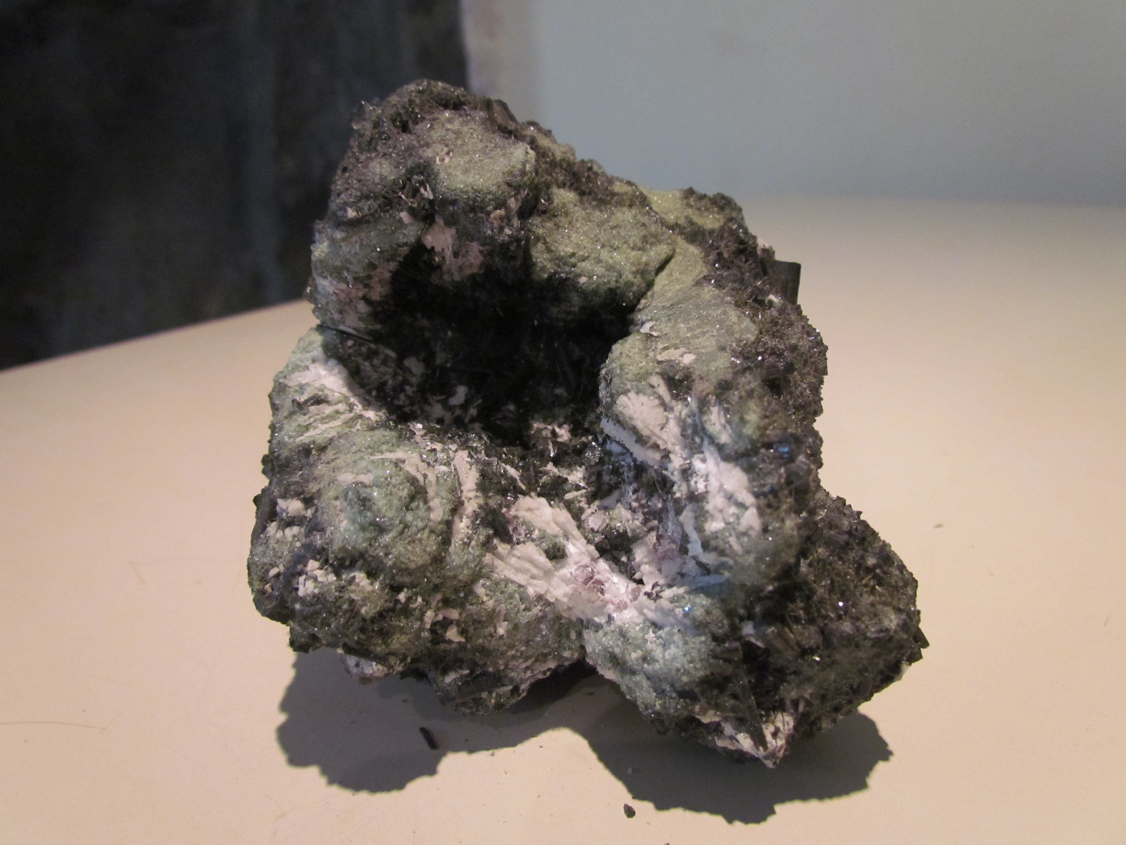 Agregado de turmalina com coloração verde e preto e cristais de feldspatos e micas