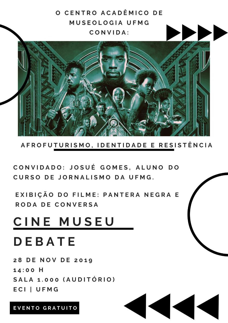 Descrição: Nessa última semana do Novembro Negro, o CAMUS – Centro Acadêmico de Museologia da UFMG convida todxs para o último Cine Museu Debate do ano. Com o tema Afrofuturismo, identidade e resistência, a atividade contará com a exibição do filme Pantera Negra seguida de uma roda de conversa com o estudante Josué Gomes, aluno de Jornalismo na UFMG, autor do artigo Wakanda, Afrofuturismo e Raça: o que diz a narrativa de Pantera Negra sobre estar negro no mundo?, vencedor do prêmio de Relevância Acadêmica do departamento de comunicação da XXVIII Semana do Conhecimento da UFMG.