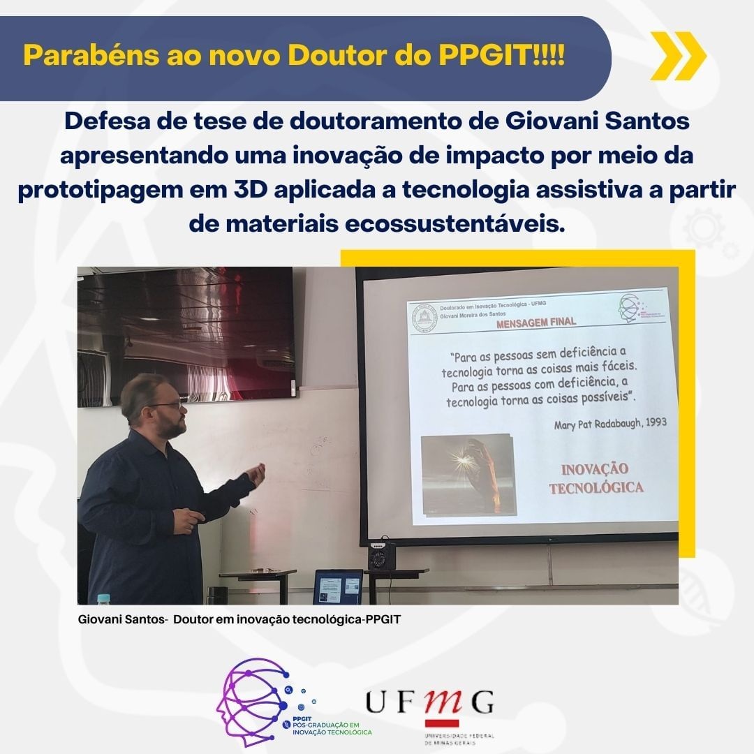 Giovani demonstrou um comprometimento excepcional com sua pesquisa, explorando a inovação tecnológica da prototipagem em 3D aplicada a tecnologia assistiva a partir de materiais ecossustentáveis. Sua dedicação e paixão pela temática brilharam durante sua defesa, e sua pesquisa promete impactar positivamente a sociedade em especial as Pessoas Com Deficiência – PCD’s e ao meio ambiente.