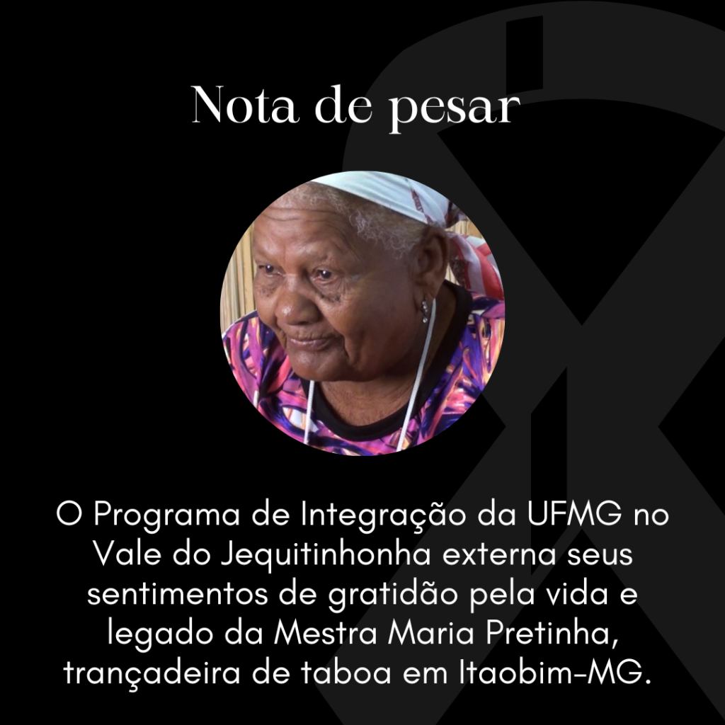 O Programa de Integração da UFMG no Vale do Jequitinhonha externa seus sentimentos de gratidão pela vida e legado da Mestra Maria Pretinha, trançadeira de taboa em Itaobim-MG, que faleceu neste mês de julho de 2022.