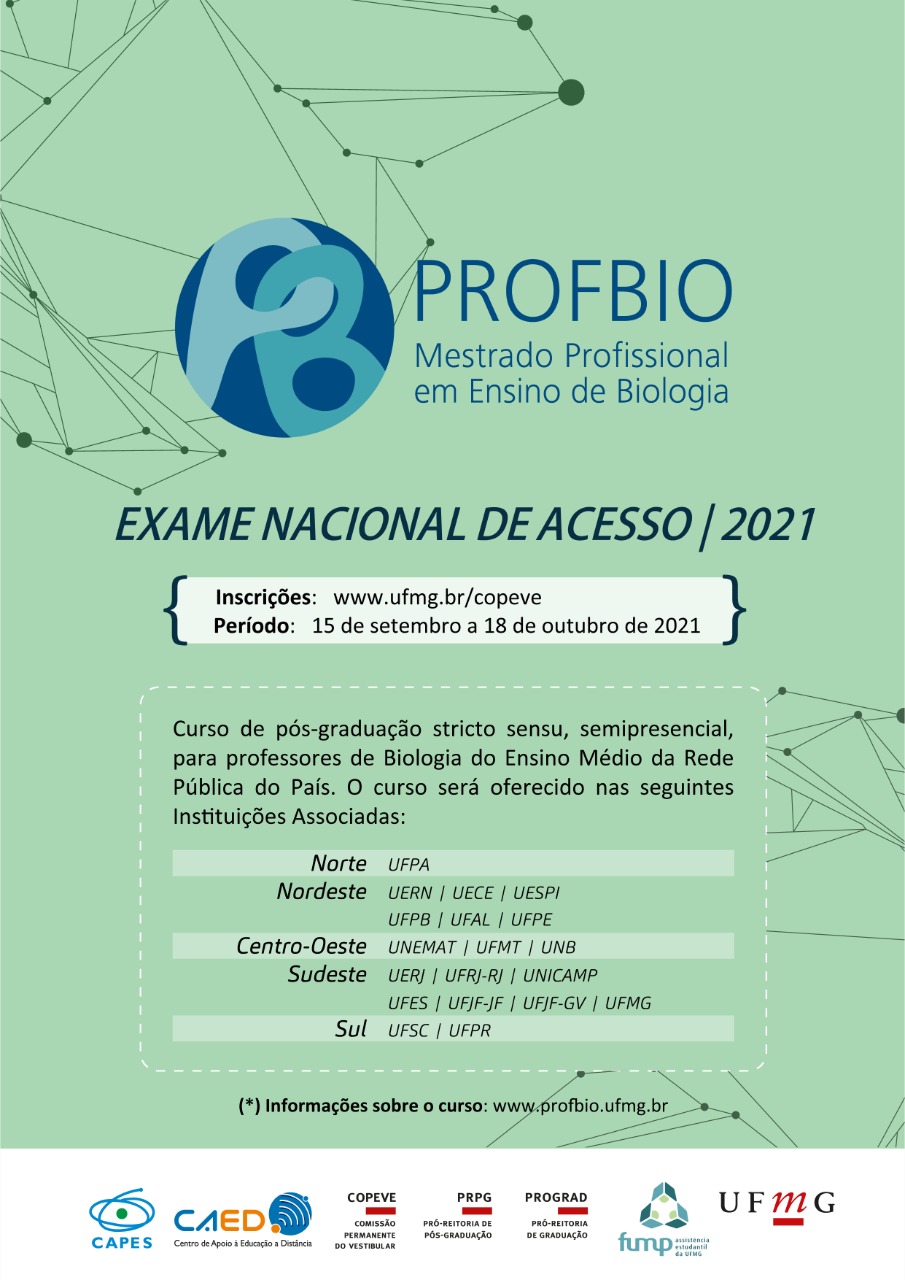 Estão abertas as inscrições para o processo de seleção para ingresso na quarta turma do PROFBIO, exclusivo para professores de Biologia no Ensino Médio da rede pública. Os professores mestrandos devem continuar ministrando aulas no Ensino Médio durante o curso, de modo que possam aplicar imediatamente a aprendizagem construída e enriquecer o curso com suas observações. Assim, acreditamos que seja de grande interesse que essa oportunidade fosse divulgada para os professores de Biologia do Ensino Médio Estadual. Segue o cartaz de divulgação em versão de imagem e de pdf. O edital e outras informações sobre a seleção estão disponíveis em http://www.ufmg.br/copeve.