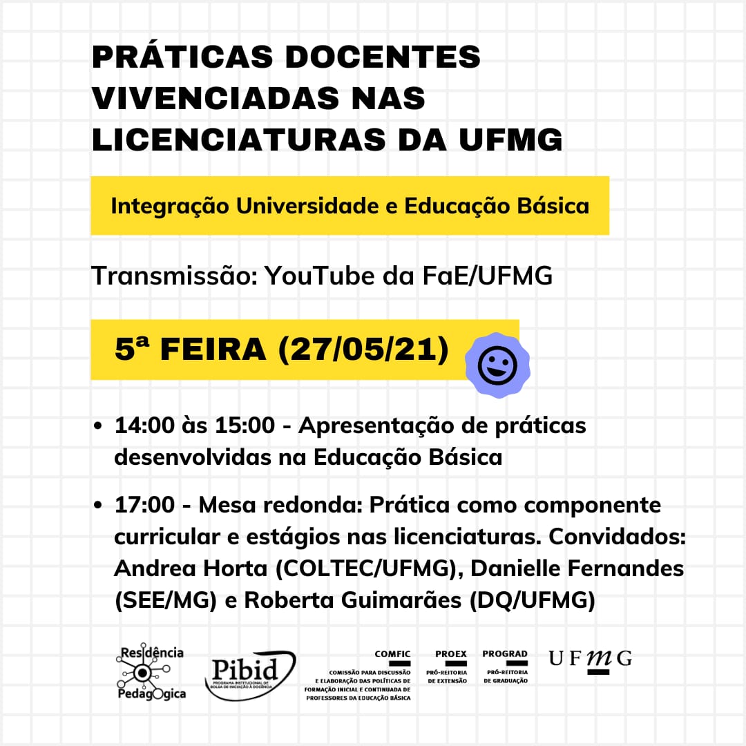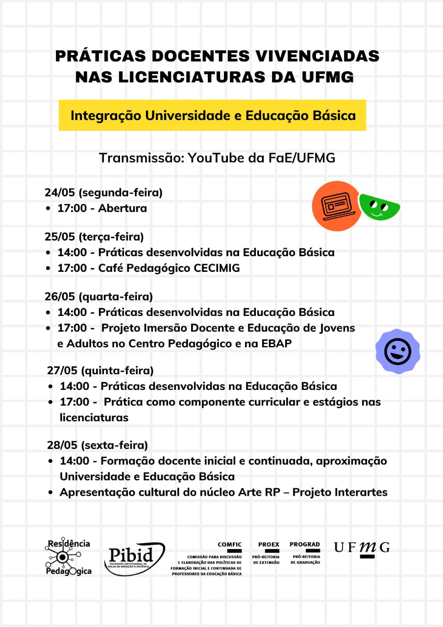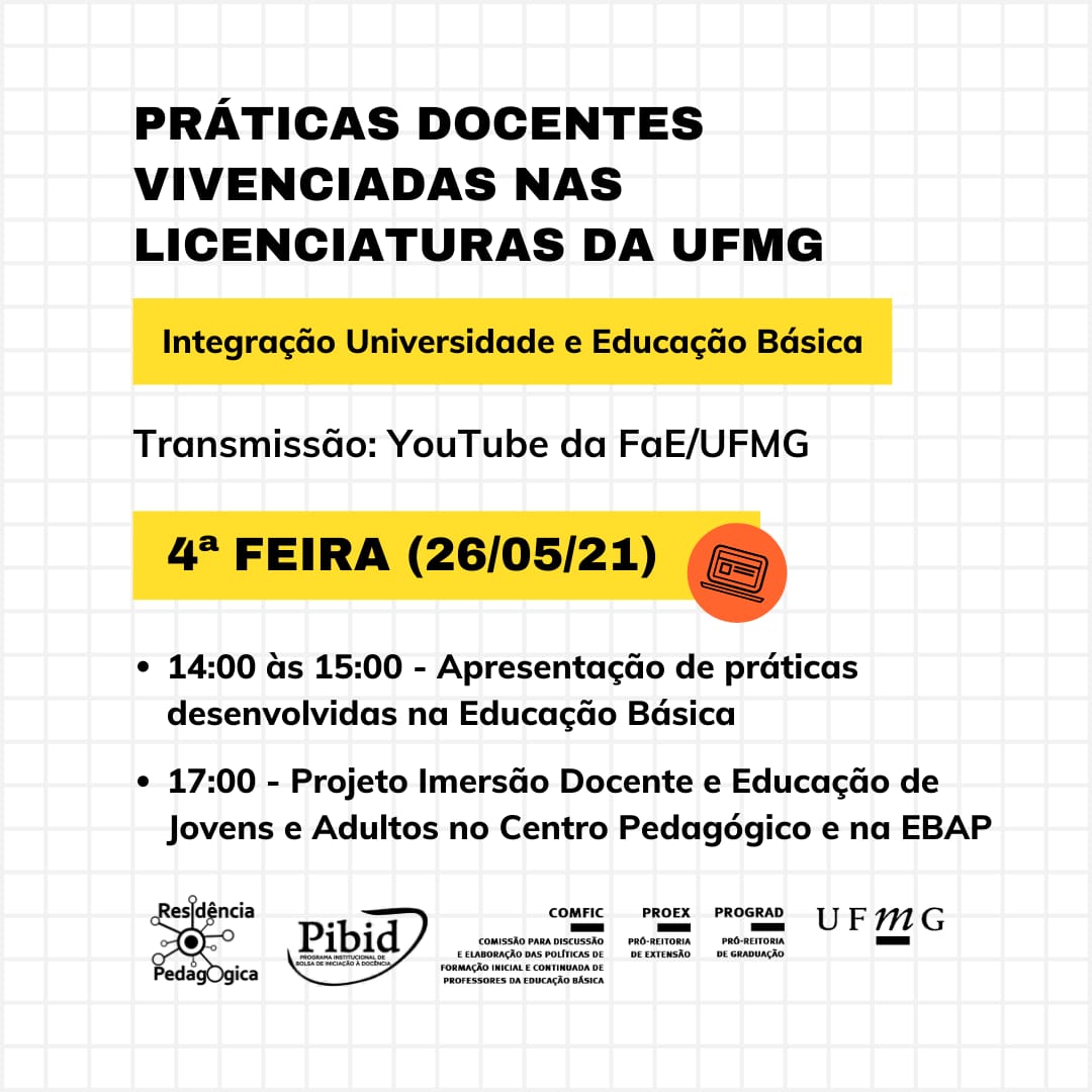 De 24 a 28 de maio a COMFIC e as coordenações do PIBID e Residência Pedagógica da UFMG promoverão o evento “Práticas Docentes vivenciadas nas Licenciaturas da UFMG”.