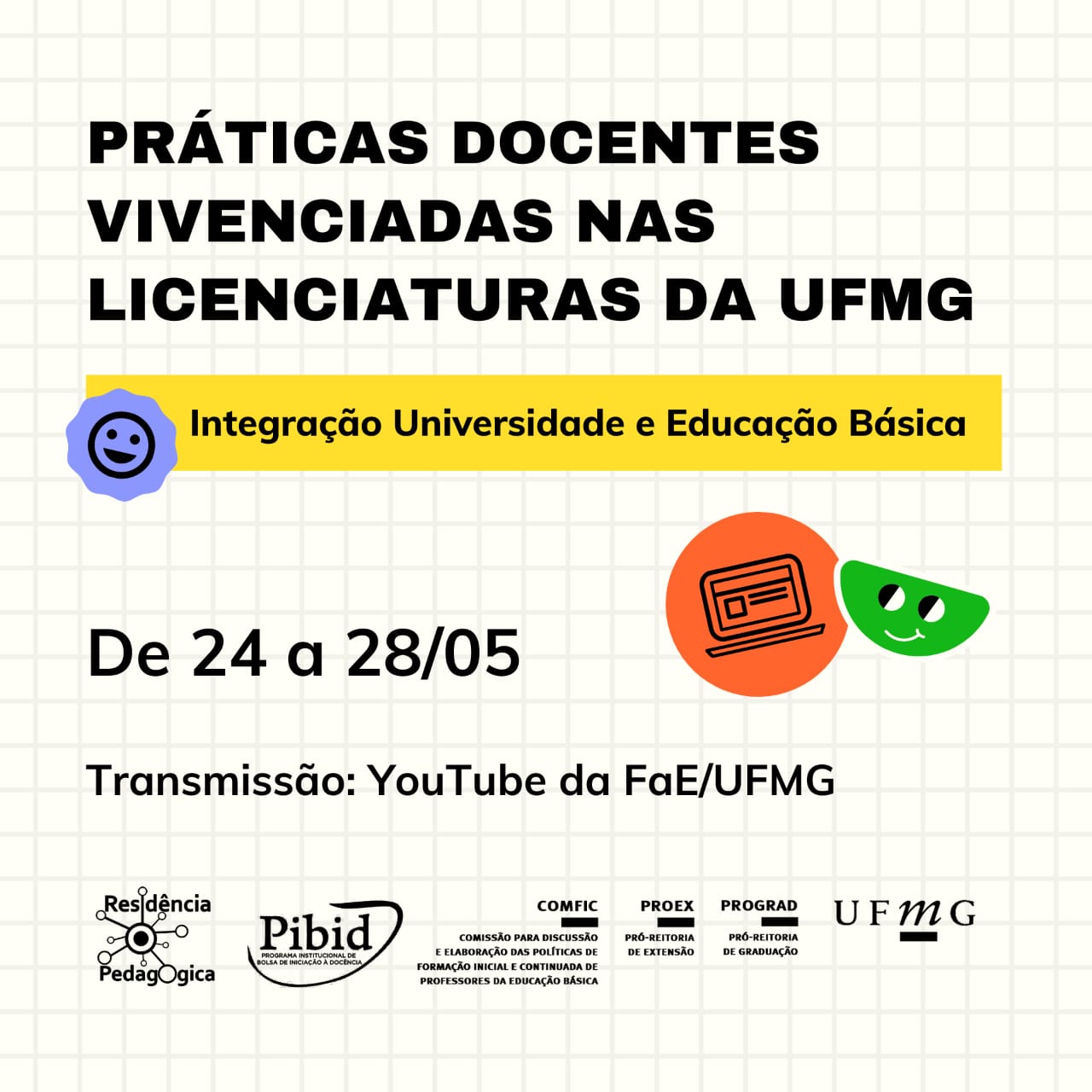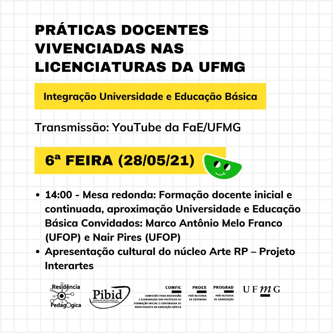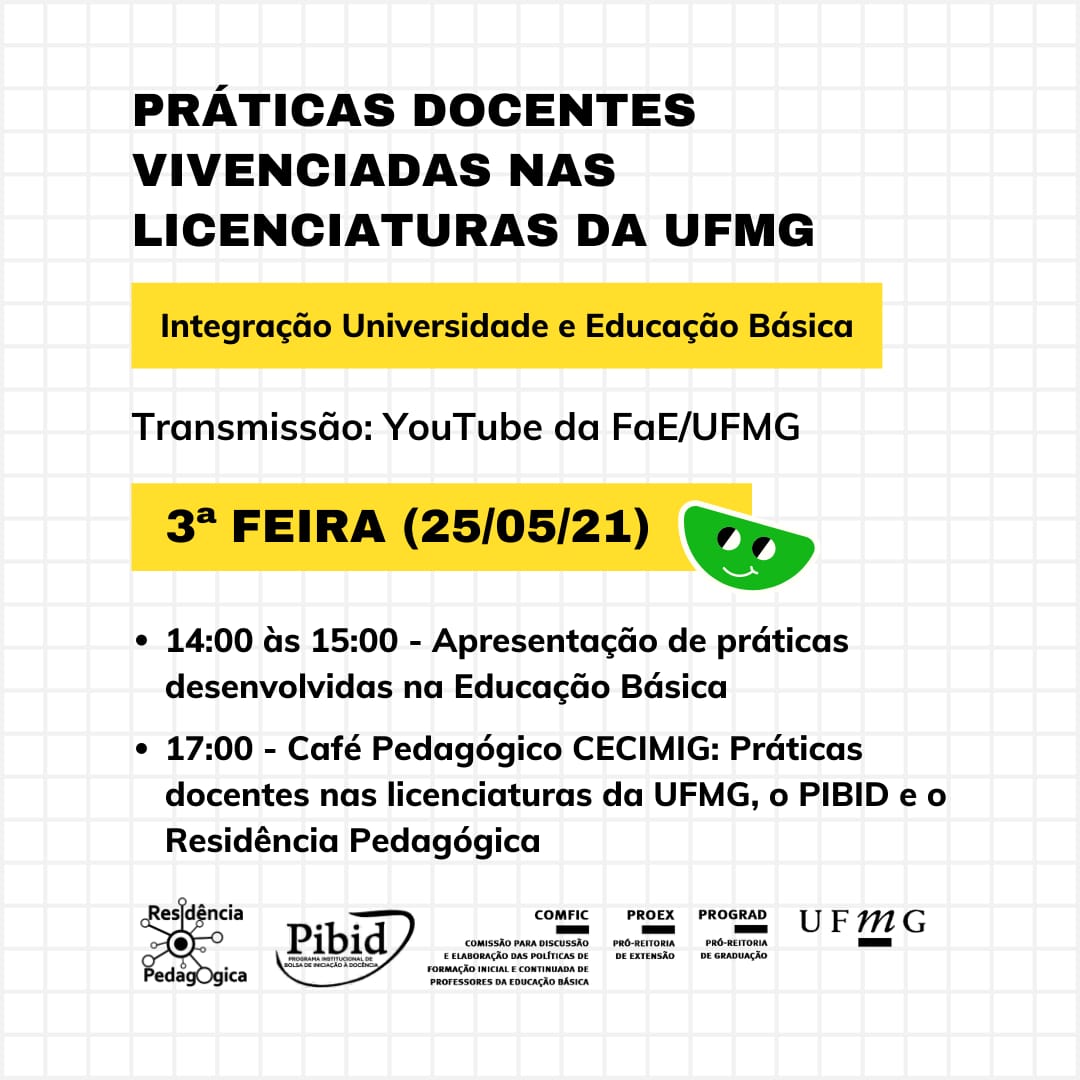 De 24 a 28 de maio a COMFIC e as coordenações do PIBID e Residência Pedagógica da UFMG promoverão o evento “Práticas Docentes vivenciadas nas Licenciaturas da UFMG”.