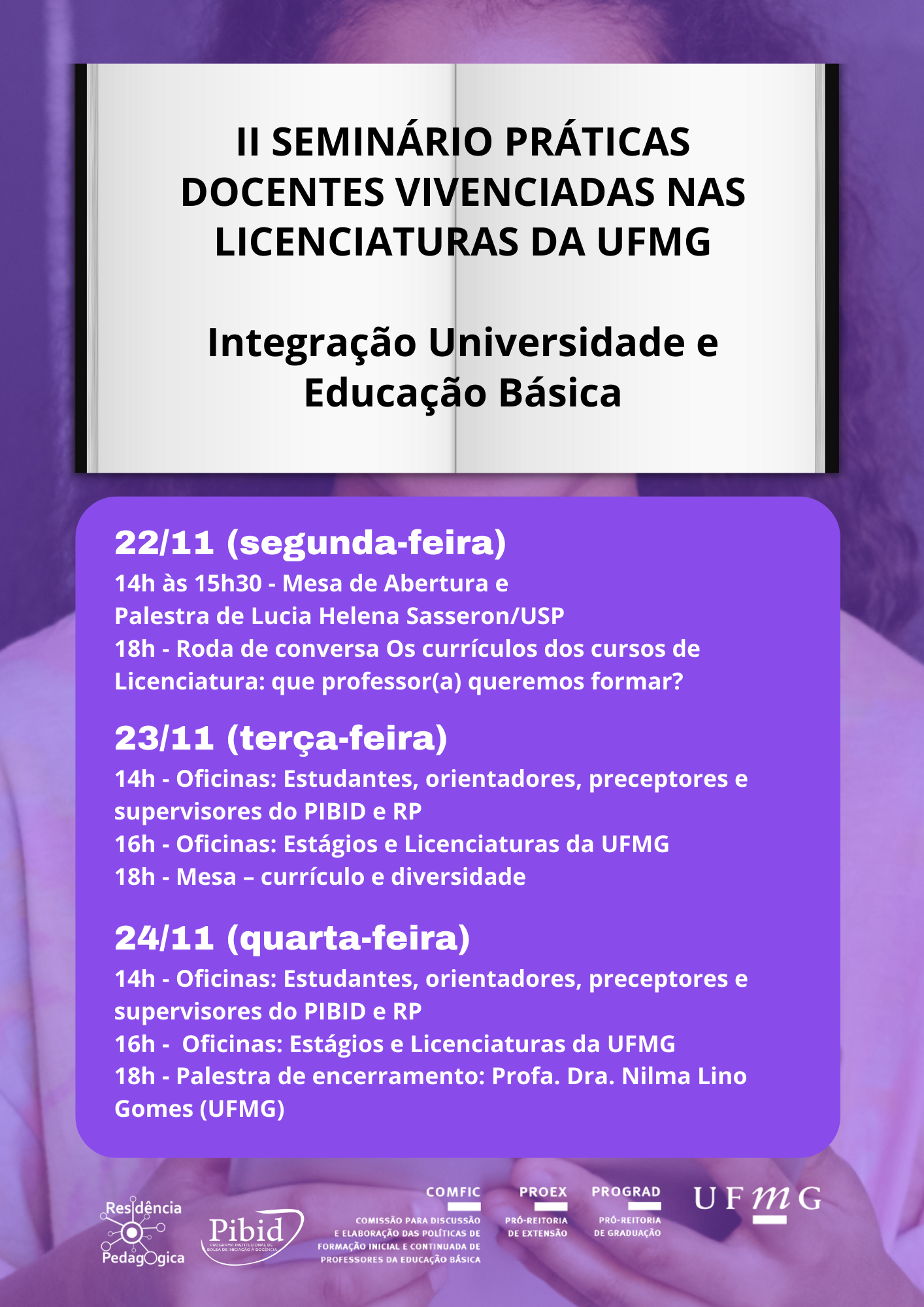 De 22 à 24 de novembro a COMFIC e as coordenações do Programa Institucional de Bolsas de Iniciação à docência (PIBID) e da Residência Pedagógica (RP) da UFMG promoverão o “II Seminário de Práticas Docentes Vivenciadas nas Licenciaturas da UFMG”.