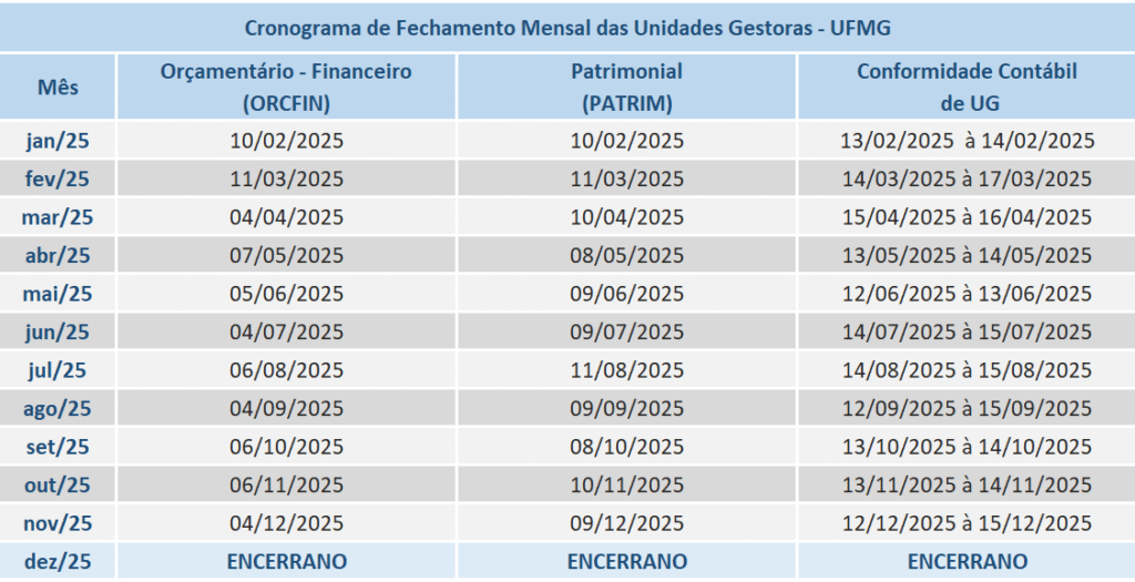 Conforme a mensagem comunica SIAFI 2024/4167290 da GESIS/CCONT/STN, a partir de 2025 cada mês passou a ter duas datas de fechamento: data de fechamento Orçamentário-Financeiro (ORCFIN) e data de fechamento Patrimonial (PATRIM).