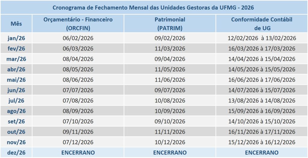 Observação: O envio dos processos SEI! contendo os relatórios de Almoxarifado (RMA), Patrimônio (RMB) e Biblioteca, utilizados nos lançamentos patrimoniais de fechamento mensal das Unidades Gestoras, deverá ocorrer até o último dia do fechamento Patrimonial (PATRIM) da respectiva UG no SIAFI, conforme o cronograma oficialmente divulgado.