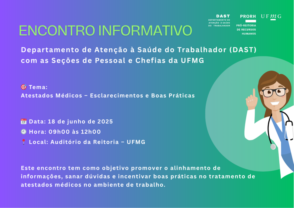 Considerando a relevância do cuidado com a saúde dos servidores e a necessidade de tratamento dos afastamentos médicos com responsabilidade e em conformidade com as normas institucionais, a Pró-Reitoria de Recursos Humanos, por meio do Departamento de Atenção à Saúde do Trabalhador, promove o Encontro Informativo sobre Atestados Médicos: Esclarecimentos e Boas Práticas, que será realizado conforme as informações a seguir: