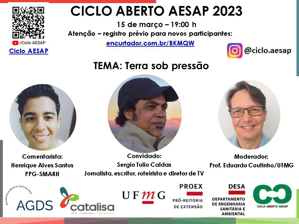Na quarta-feira, 15 de março de 2023, o encontro mensal do Ciclo Aberto de Encontros da disciplina Avaliação de ecoeficiência e sustentabilidade aplicada a projetos (Aesap) promove a sua 15ª edição, com o jornalista e escritor Sergio Tulio Caldas. Ele vai ministrar, a partir das 19h, a conferência Terra sob pressão, por meio da plataforma Teams. Ouvintes que forem participar pela primeira vez do ciclo devem preencher o formulário eletrônico para registro e acesso ao link da transmissão.